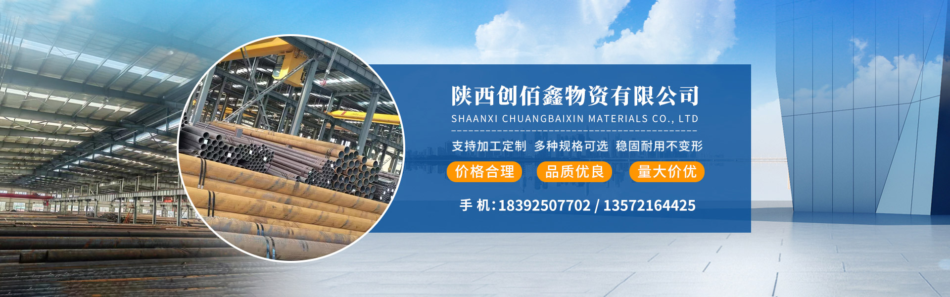 陕西创佰鑫物资有限公司是经西安市工商部门正规注册的专业钢材贸易与加工企业,坐落于西安市临潼区中储物流园,依托西北核心建材物流枢纽的区位优势,立足西北、辐射全国,专注为各类客户提供优质钢材产品及配套加工服务。公司自成立以来,始终秉持诚信经营、品质为本、服务至上的核心理念,合规稳健运营,与国内多家知名钢厂建立长期稳定的合作关系,构建了稳定可靠的货源渠道,严格把控产品质量,力求所提供的钢材产品符合行业标准及客户需求。公司主营各类管材、型材及钢板加工业务,管材涵盖镀锌管、焊管、无缝管···